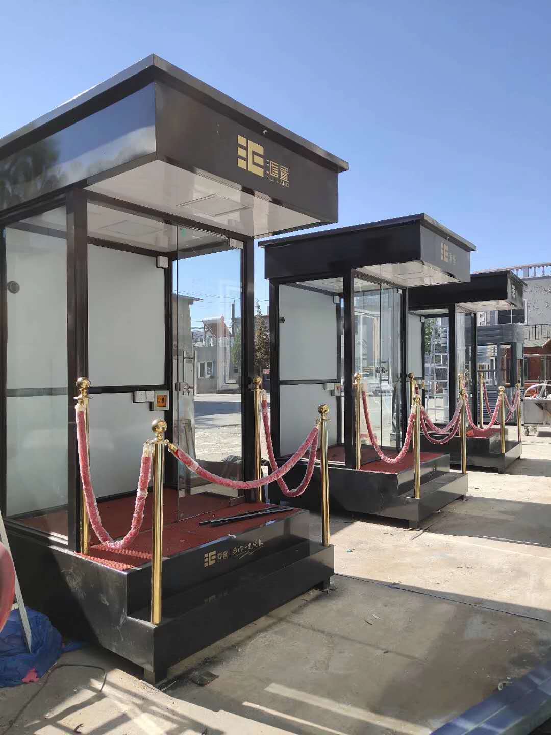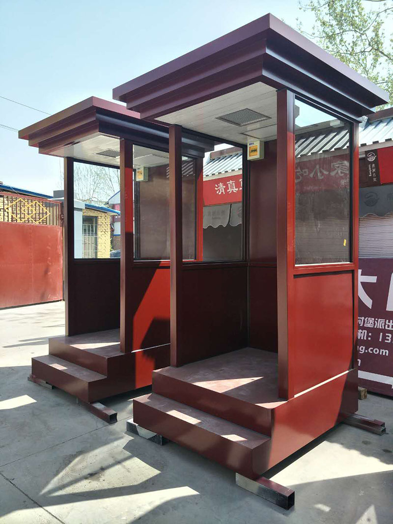 值班崗亭的主要龍骨為鋼結構龍骨,起尺寸為40x60x1.5mm鍍鋅龍骨;立柱一般為堅固耐用的型鋼,尺寸規格有80x80x2.0mm,40x80x2.0mm等等,可根據產品的大小不同而來決定立柱的大小;玻璃一般為8mm鋼化玻璃,具有較強的抗沖擊力,即使破碎也不會傷到人;地板為3mm防滑鋼板,鋪紅色地毯,四周可用鈦金立柱和紅絨繩作為裝飾件,使產品看起來更美觀,大氣,高檔。